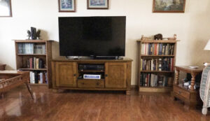Over the years I have learned to make, my prayers of last resort, my FIRST PRAYERS. And I learned how to apply the POWER AND FORCE OF FAITH WITH PATIENCE to my dreams as I started this project where I was, with what I had, and I began to do what I could. I dreamed, Prayed, and acted in faith and patience. Through my faith empowered actions I had called things that “were not” as though they were. Weeks later I received my new tool purchased from money saved. Then using the lumber from the fallen Elm tree I did build a new set of book cases shown here on right and left of TV set.